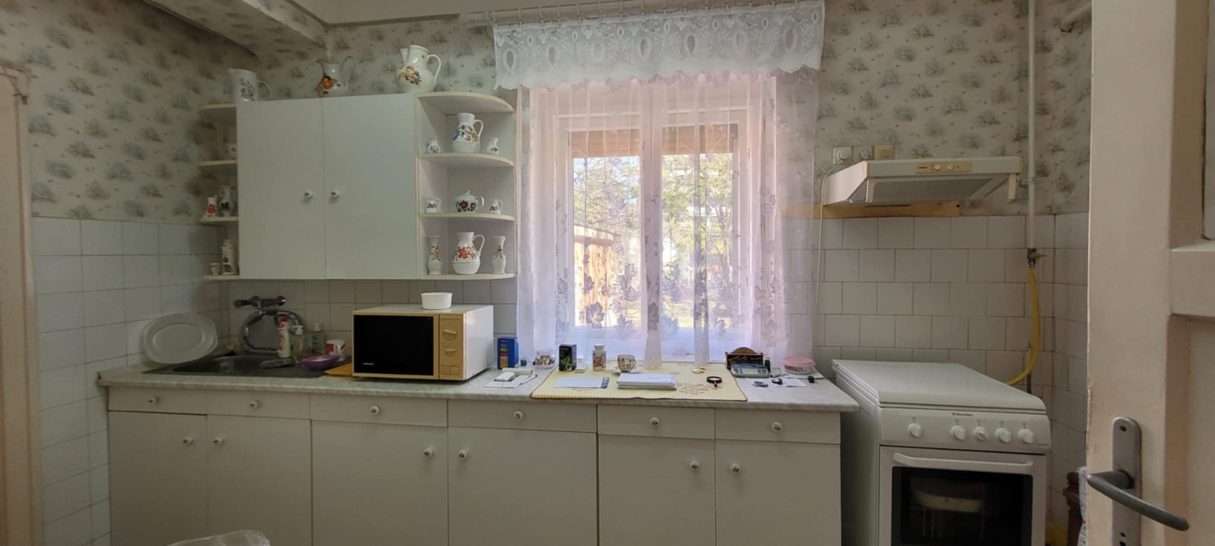 Az ingatlan téglából épült, cserép tetős, átlagos állapotú. Fa nyílászárók, redőnnyel, a bejárati ajtó új állapotú. Gázkazánról biztosított a fűtés, radiátor fűtőtestekkel.