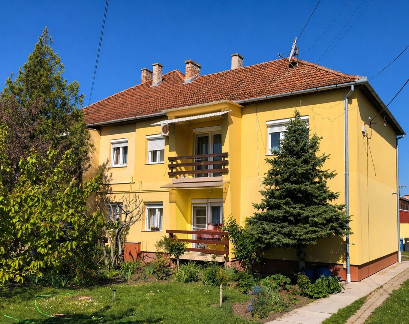 A ház és az utca közötti hangulatos, parkosított előkerten keresztül érhetjük el az épületet. A gépkocsival történő kényelmes bejutást a távirányítású elektromos kapu biztosítja. A beton alappal, tégla falazattal épített ingatlan részbeni korszerűsítése során a régi nyílászárókat modern, hang és hőszigetelt műanyagra cserélték, amelyeket redőnnyel, szúnyoghálóval láttak el. A falak külső homlokzati szigetelése is megtörtént. A lakás fűtését, meleg víz ellátását újszerű kombi gázkazán, hűtését két klíma biztosítja.