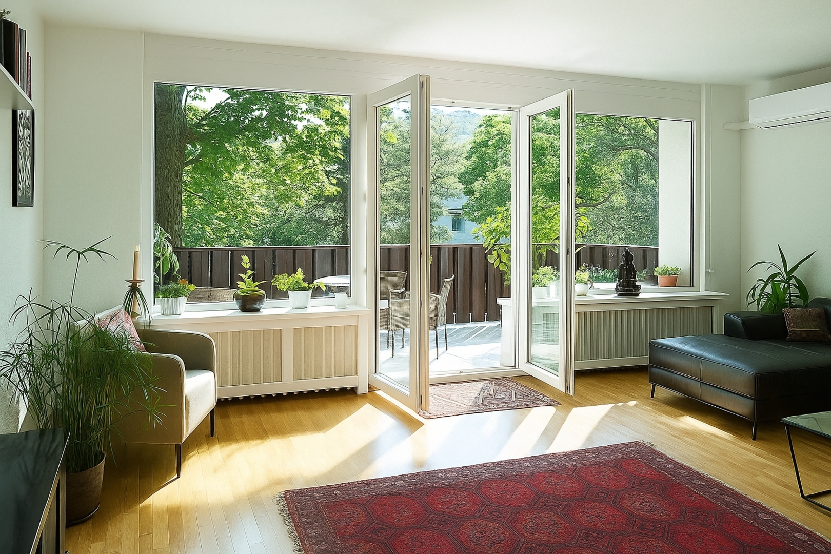 A nappaliból közvetlen kijárat nyílik a délnyugati fekvésű, tágas teraszra. Ez a helyszín ideális a reggeli kávéhoz vagy egy csendes délutáni pihenéshez, miközben a környező fák lombjai és a madárcsicsergés teszik teljessé a hangulatot.