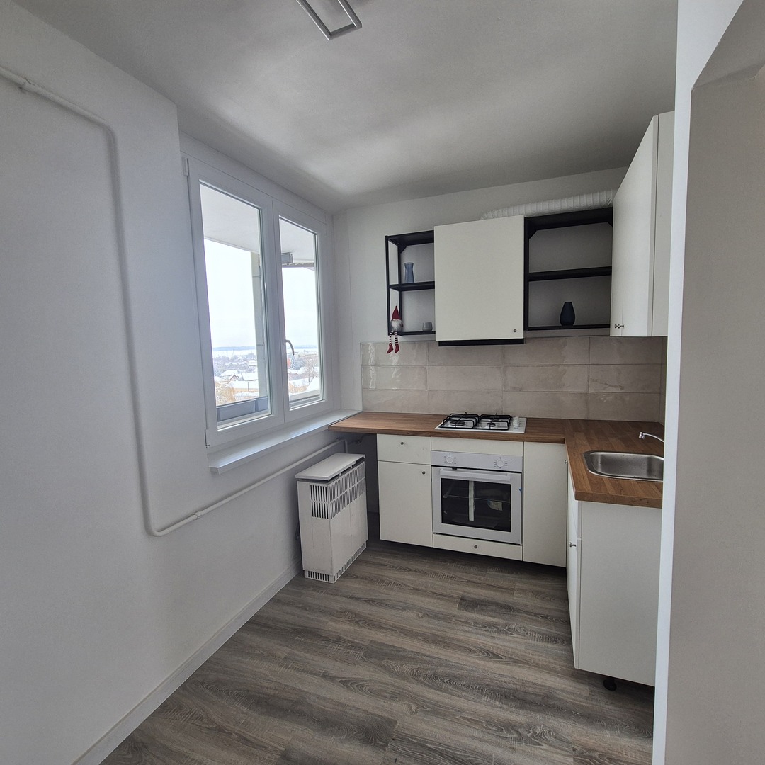 Az átgondolt átalakítás során két tágas szoba, egy kényelmes nappali tér és egy étkezős konyha került kialakításra, amely tökéletesen illeszkedik a mai igényekhez.