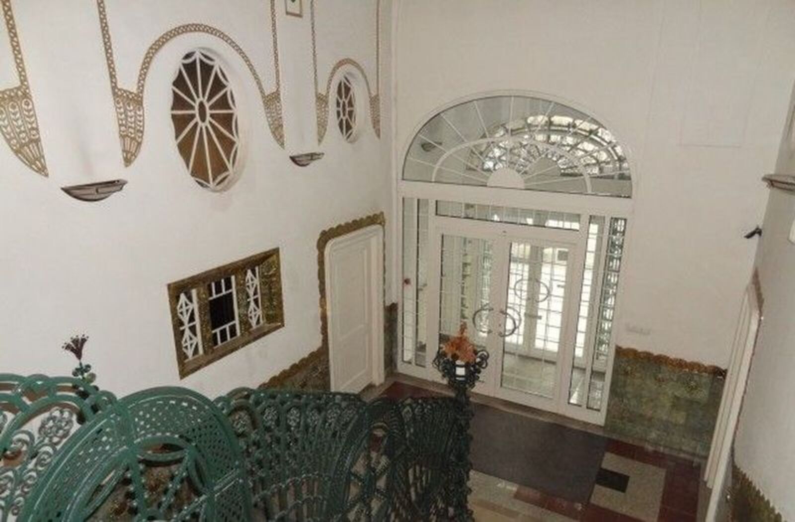 A főbejárati előcsarnok patinás zsolnai kerámia berakásos falburkolata és a főlépcső pávadíszes kovácsoltvas korlátja reprezentatív bejárati teret képez az irodaháznak.